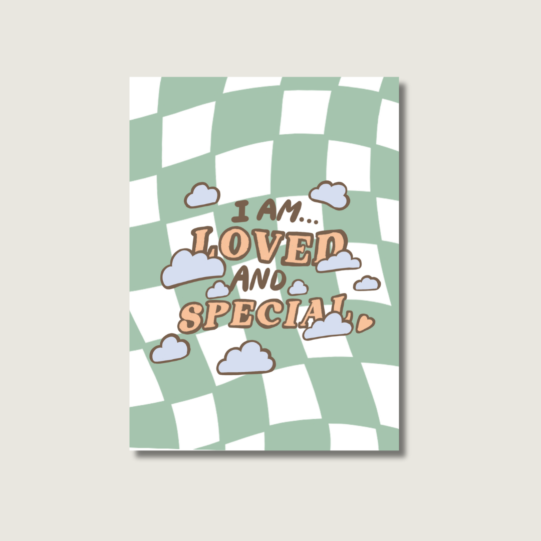 Reasons to love this: This is a perfect daily reminder that you are loved and special. With its whimsical green checkered background, soft clouds, and uplifting message. Whether displayed on your desk as an art print, added to a mood board, or gifted to someone you care about as a postcard, it's totally up to you! Printed on premium shimmering paper, making it a beautiful and meaningful addition in your space.